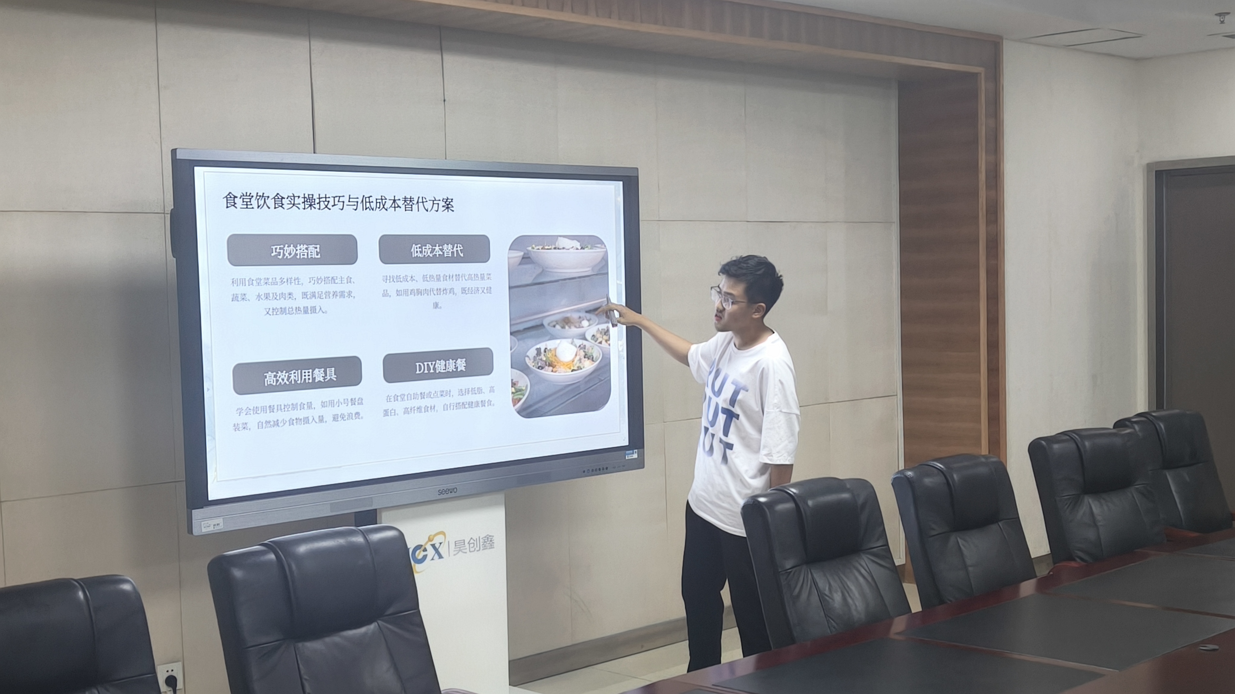 针对学业压力引发的饮食失衡,学生提出“备考能量补给方案”,推荐用坚果、黑巧克力替代高热量零食,并展示“10分钟宿舍健康餐”食谱。为解决宿舍健身难题,团队设计矿泉水瓶负重训练、课间肩颈放松操等“轻量化健身法”,兼顾经济性与便利性。
