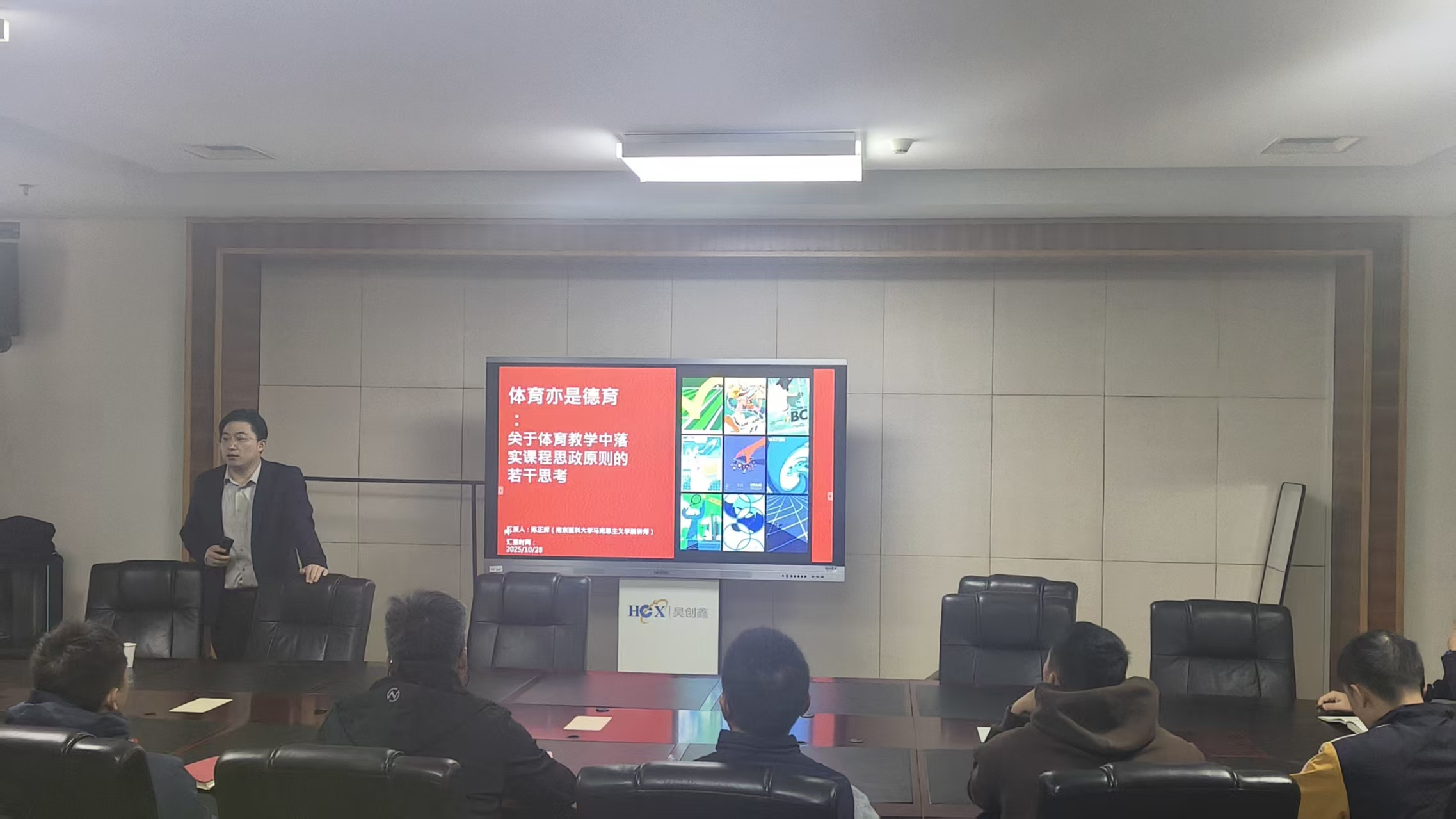2025年10月28日,南京医科大学马克思主义学院讲师陈正辉围绕“体育亦是德育——关于体育教学中落实课程思政原则的若干思考”主题开展汇报,系统阐释体育与思政教育的融合逻辑与实践路径。南京医科大学体育部全体教师聆听汇报。