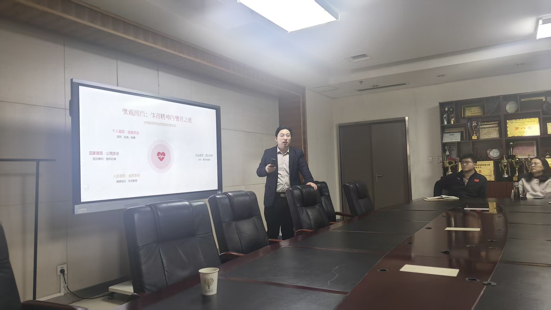 汇报首先澄明思想政治教育核心内涵,指出其是将社会思想道德转化为个体品质的有组织教育活动,学校思政教育需以“思政课程+课程思政”同向同行应对思潮挑战,依托知识、价值、载体、方法四大要素构建体系。在体育教学与思政的关联层面,汇报援引马克思主义经典理论与习近平总书记重要论述,强调体育是促进人全面发展的重要手段,宏观上天然具备思政功能,是落实立德树人的关键环节;微观上可从个人(坚持、自律)、社会(协作、集体荣誉)、人生(健康观念)、国家(规则意识)四个维度实现德育渗透。