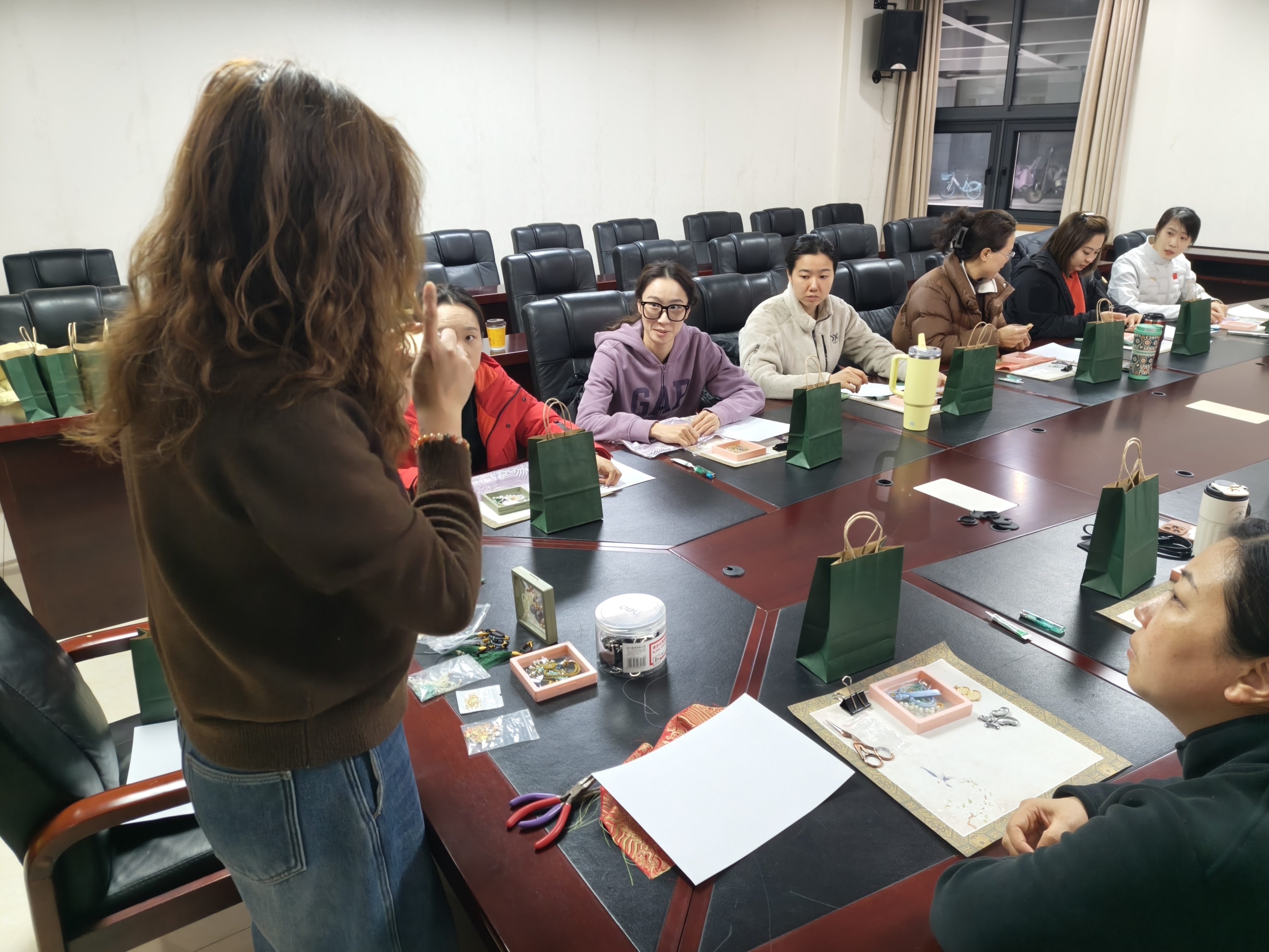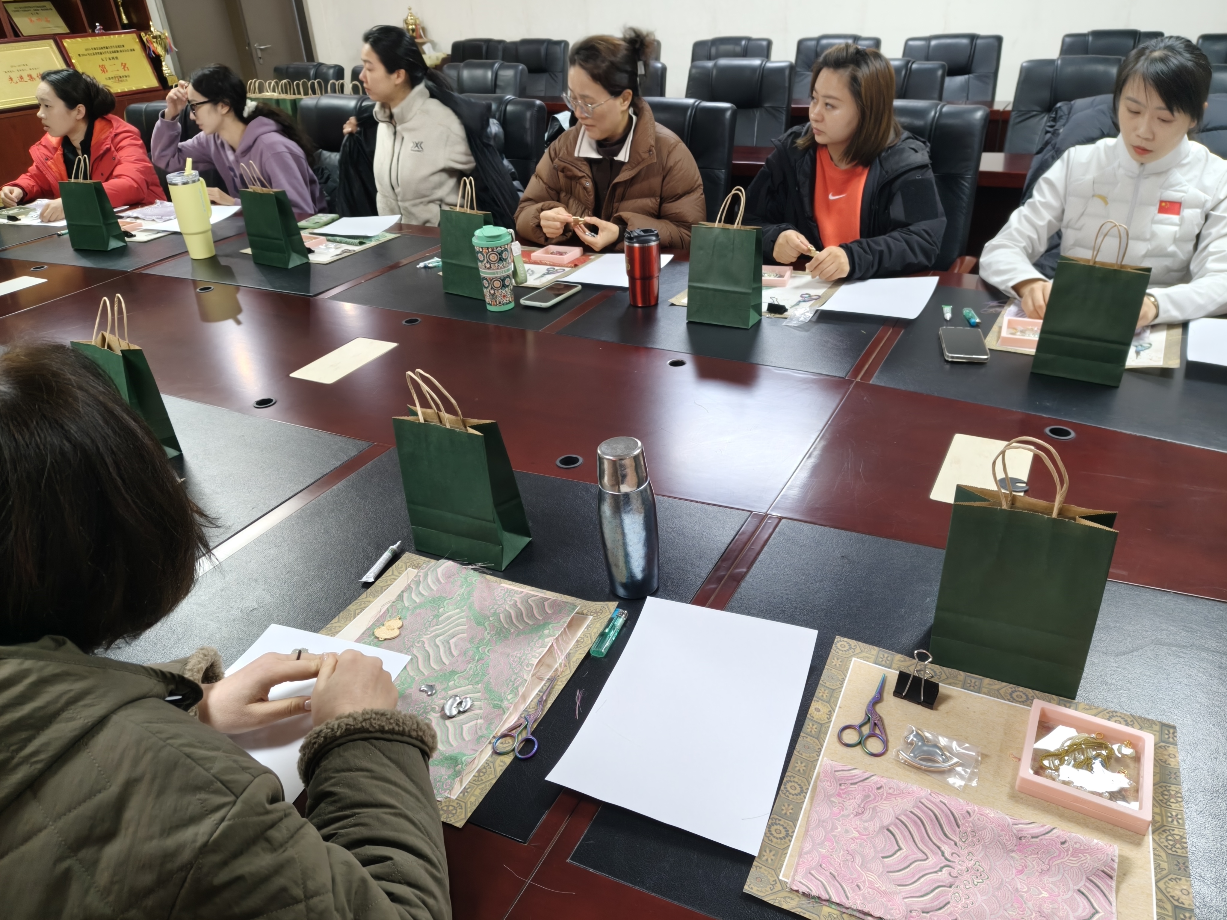 活动现场,部门女教职工们在课外老师指导下,学习宋锦非遗文化与制作工艺,并亲自动手完成宋锦配饰创作。大家在交流与创作中舒缓压力、增进情谊,感受传统工艺魅力。
